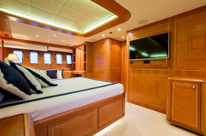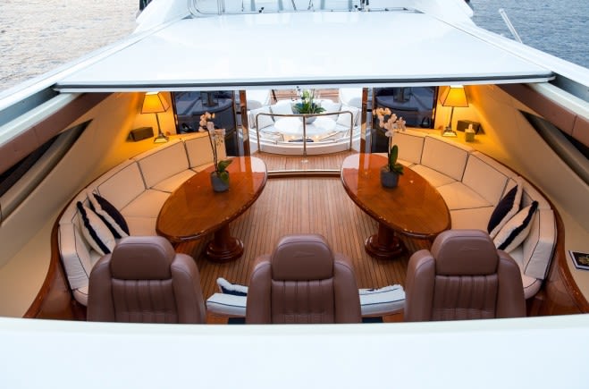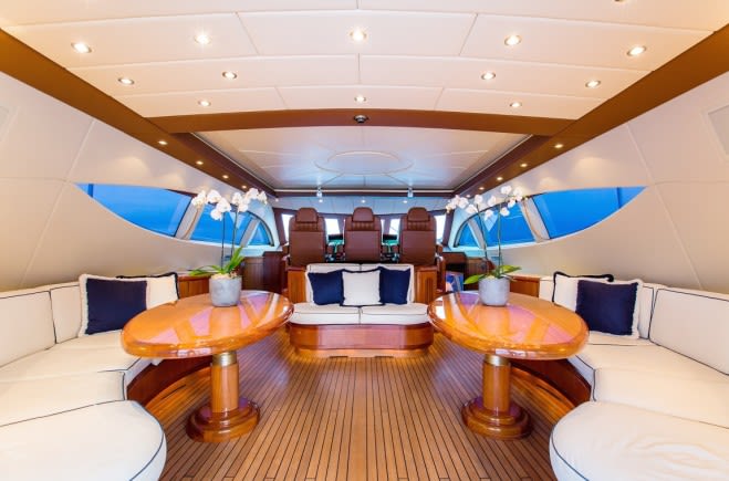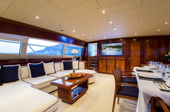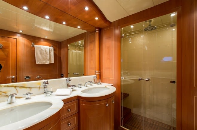 Her interior is beautifully decorated in rich woods and opulent marbles. The main deck salon is adjacent to the aft deck, and has a retractable hard top that allows sunlight to stream in as desired. The space has a lounge area with large, opposing white sofas, each with a coffee table, a full bar, and an entertainment centre with a large plasma television screen and a Bose stereo surround sound system. Below deck is a second salon with a lounge that features a large white sofa and a coffee table, an entertainment center, and a formal dining area with seating for eight guests. Long windows bring plenty of light into the space.