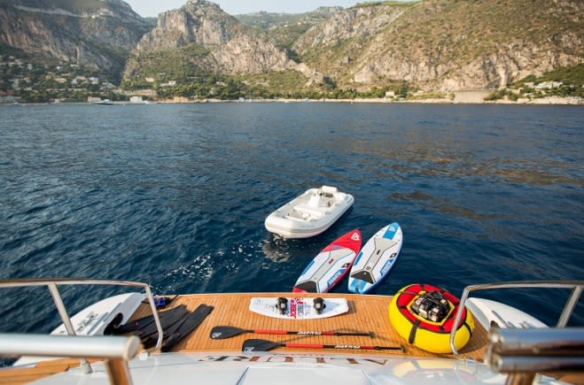Outdoors, ALLURE has everything you need for entertaining, dining, and relaxing. Sliding glass doors from the main salon lead to the aft deck, with its semi-circular upholstered seating around a circular table. This is a great spot for cocktails, snacks and conversation. An al fresco dining area is also on the aft deck, with a spectacular view of the swim platform and the sea. There is a hot tub, a selection of sun pads, and two large parasols for optional shade. Sunseekers will adore escaping to the more private foredeck sunbeds.