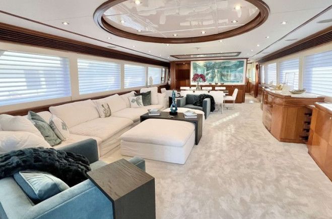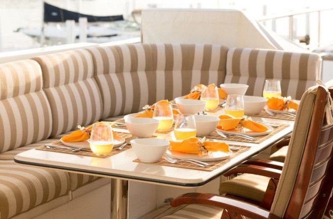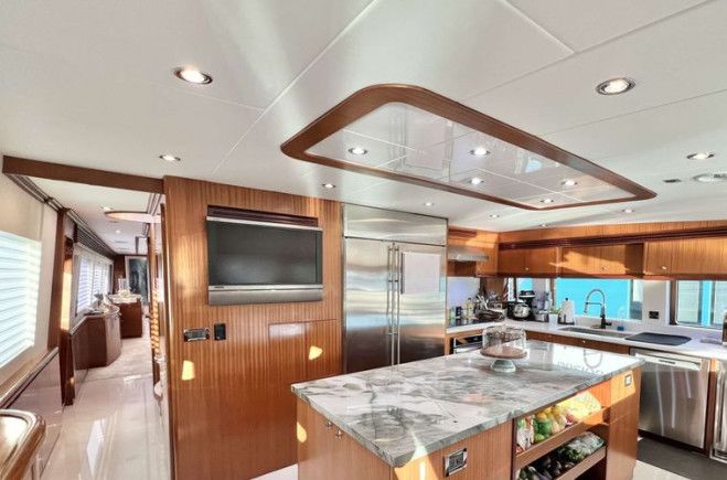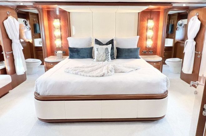 The interior design of Beachfront, which is the work of Lynn Levy, is equal parts stylish and contemporary. Throughout the yacht’s interiors, guests onboard will find a light and airy design scheme, one centering around a large, open-plan salon and dining room with neutral textiles. The dining room is well-appointed with an elegant table and high-back chairs, while a country-style kitchen gives guests a place to relax in a calmer, more casual setting. Panoramic windows surround the main deck, letting in ample natural light. When the sun goes down, a state-of-the-art entertainment system in the salon is the perfect way to relax on a night in.