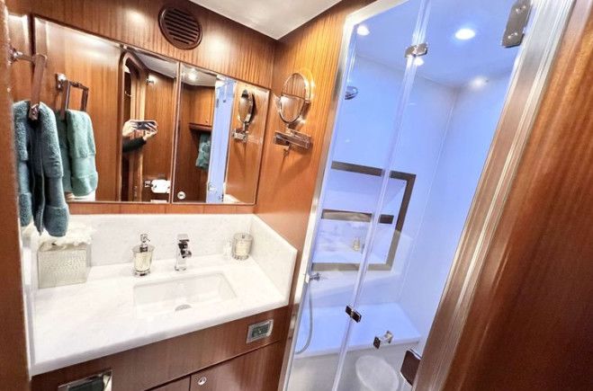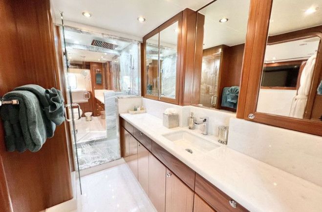 Full beam Master stateroom w/ Double walk in closets and a large lounge area. His & hers bathroom w/ shower