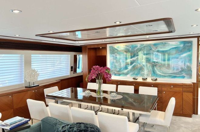BEACHFRONT’s interior has a contemporary style and well-thought-out layout. She is easily adapted to any situation. She features a high-tech home theatre with more than 500 HD movies and a music library of more than 70,000 songs. Airplay broadcast is available throughout the yacht with ability to play music through speakers almost anywhere. BEACHFRONT has five lavish staterooms, catering to up to 10 guests. Her full-beam master has double walk-in closest and a lounge. Four additional staterooms, including a VIP forward all have en-suite bathrooms. A guest common area is located forward.