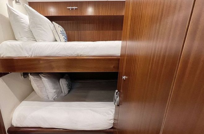 Beachfront can accommodate 10 guests in 5 cabins. A full-beam Master suite with King size bed, double walk-in closet, lounge, and en suite bathroom. A VIP stateroom with Queen size bed and en suite bathroom. 2 Queen staterooms, each with en suite bathroom. A Twin stateroom with over/under berths and en suite bathroom.