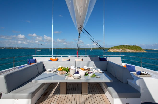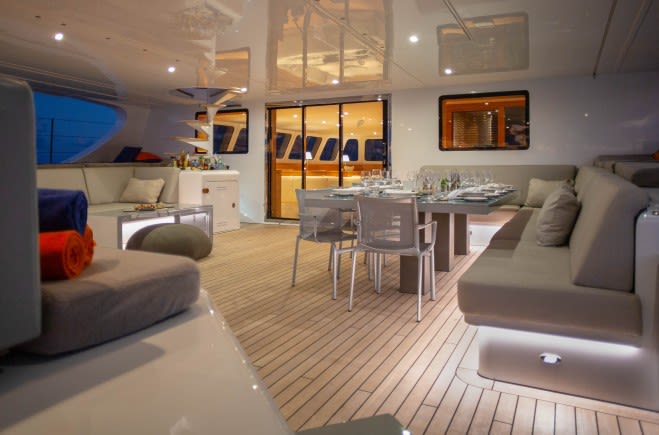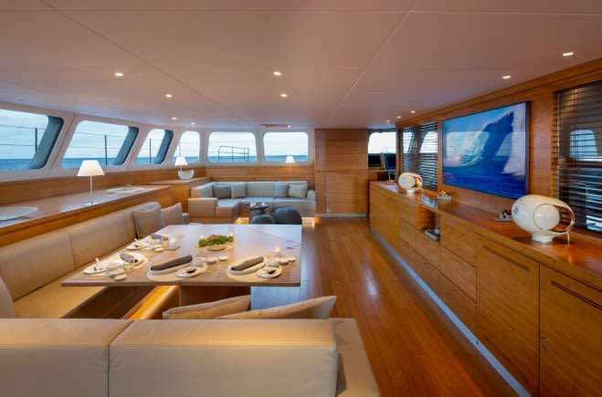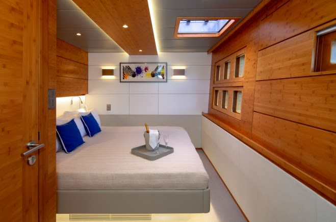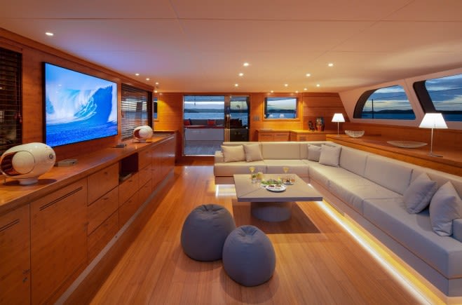 Excellent option for extensive overnight anchoring Great selection of water toys including 2 Tiwal sailing dinghy’s, 2 Kayaks, 1 Inflatable Windsurfer, Water-skis, 2 Wakeboards and donuts. Modern interior design with mat bamboo veneer finish and grey upholstery Bose surround sound system Fantastic family yacht with a very pro-active crew of 6