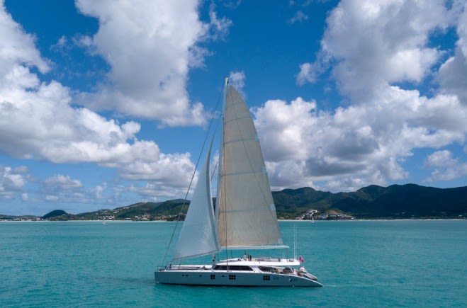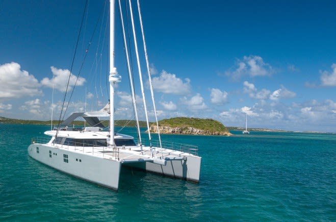 A stunning 35m sailing catamaran built by Sunreef Yachts in 2010 and refitted in 2018 with new interior décor in cream and white colours giving her a nice, spacious and modern feel. CHE offers superb comfort, huge exterior deck spaces with 2 “al fresco” dining areas, 55m2 flybridge with sun pads for sun lovers and an impressive 103m2 cockpit with lounge area, large table, easy access to the water from the swimming platform.