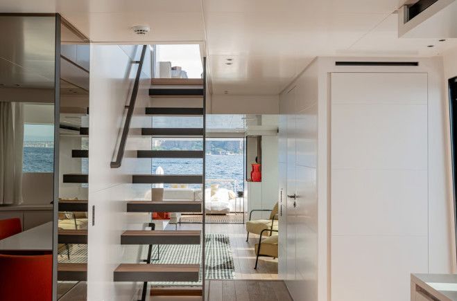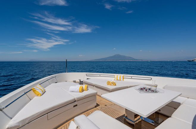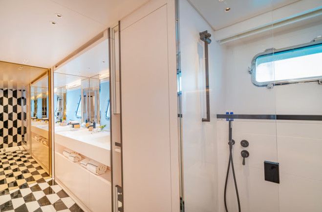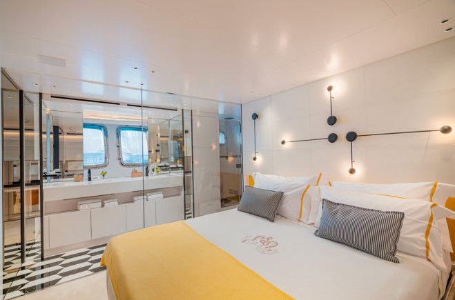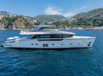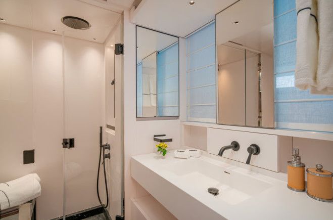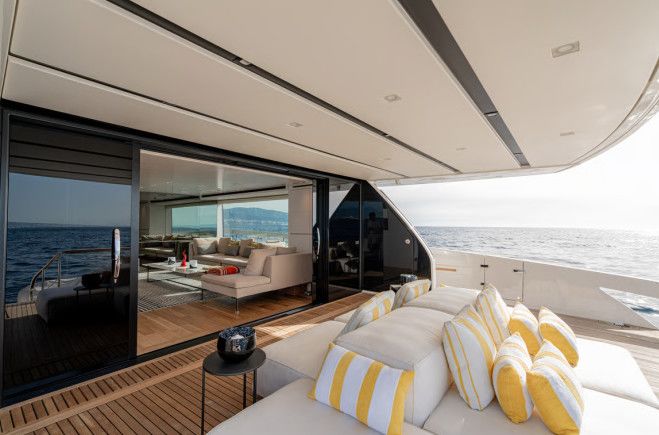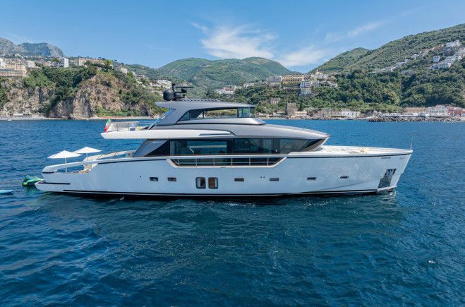 Experience luxury aboard the "DANIDA’" Sanlorenzo SX88. The revolutionary design of the SX88 features wide open spaces and large glass windows, creating a seamless connection between the interior and exterior, catering to the most discerning clients. The high, seaworthy bow gracefully slopes toward the stern, streamlining the yacht’s profile while ensuring exceptional all-weather performance. The main deck’s fore area is equipped with a sofa, a coffee table, and an extended sunbathing surface, providing a relaxing and functional living space. The stern area is equally impressive, boasting a "beach club" space that is five steps below the main deck. This 30 sq. m area is shaded by parasols and furnished to perfection, offering a luxurious spot to enjoy life at the water’s edge. It also provides ample room for a variety of water toys, enhancing your on-water experience. Below deck, the Sanlorenzo SX88 offers luxurious accommodations with four cabins: a Master cabin, a VIP cabin, and two Twin cabins, ensuring comfort for all guests. DANIDA’ is also serviced by a dedicated crew of four, ensuring an exceptional onboard experience.