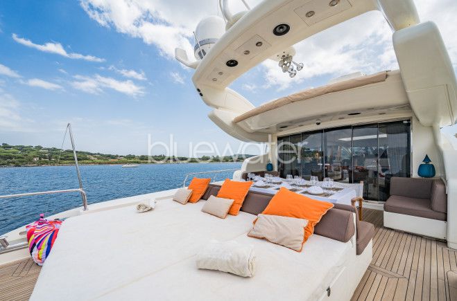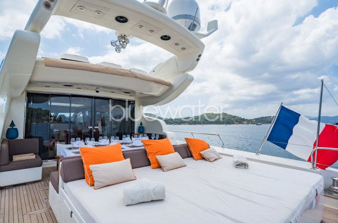 ECLAT’s exterior living spaces are equally impressive. The aft deck offers alfresco dining, a large raised sunpad, and a removable shade for relaxation and enjoyment. Further aft, a full beam extended swim platform provides effortless access to an array of water toys for guest entertainment. The main deck wraps around the yacht 360°, leading to a spacious foredeck with an additional built-in large sunpad, perfect for basking in the sun and soaking in the breathtaking views.