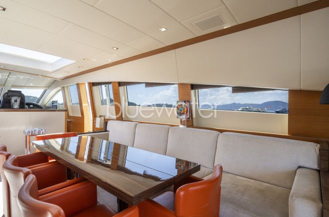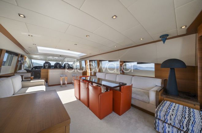 Step into her luxurious interior living spaces, adorned with dark wood floors, medium-toned wood panels, and crisp white linings, seamlessly complementing the neutral soft furnishings. The spacious saloon boasts a generous layout, featuring two large sofas, complete entertainment systems, and an abundance of natural light streaming through elongated side windows. A wide sliding glass door effortlessly connects the saloon to the aft deck, creating a versatile and inviting socializing area for any occasion.