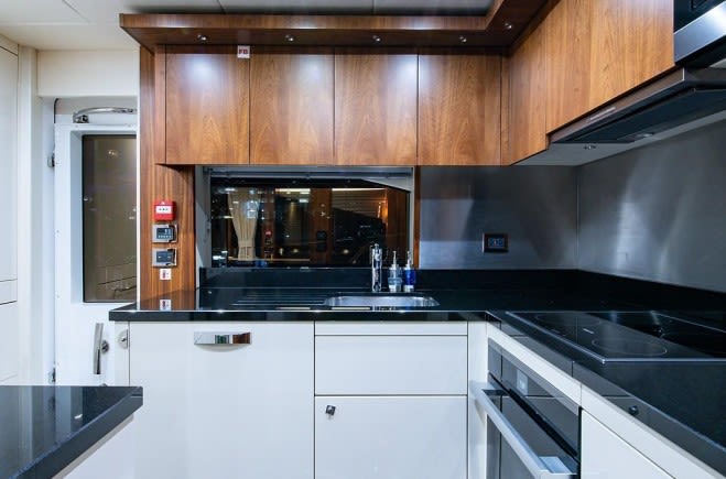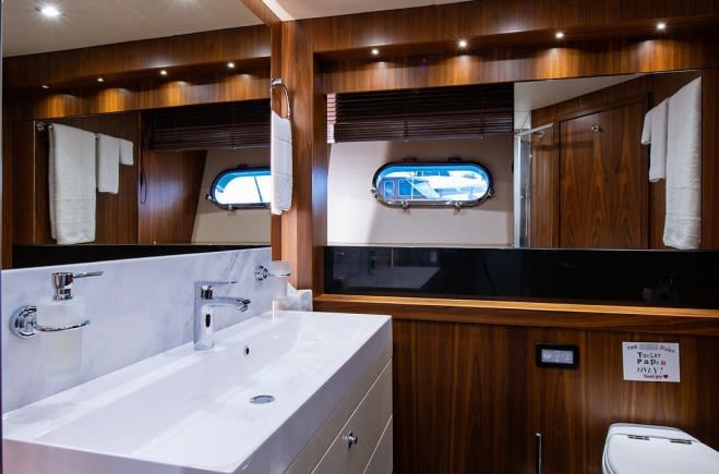 Elite’s cabins consist of a full-beam Master suite, VIP suite and port and starboard twins with pullmans, all with stereo surround sound systems, Samsung television screens and en-suite heads. The saloon has a large settee and coffee tables to port, while to starboard is an entertainment centre including a 55-inch Samsung television screen on a rise and fall mechanism and a stereo surround sound system. Also to starboard is a drop-down sea balcony. Forward is a bar and liquor cabinet and a dining area with seating for ten guests.