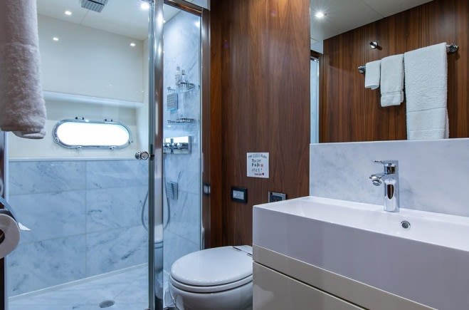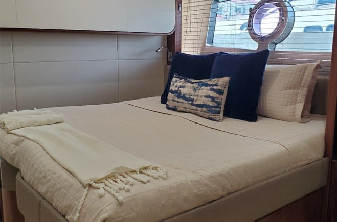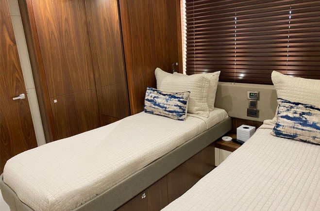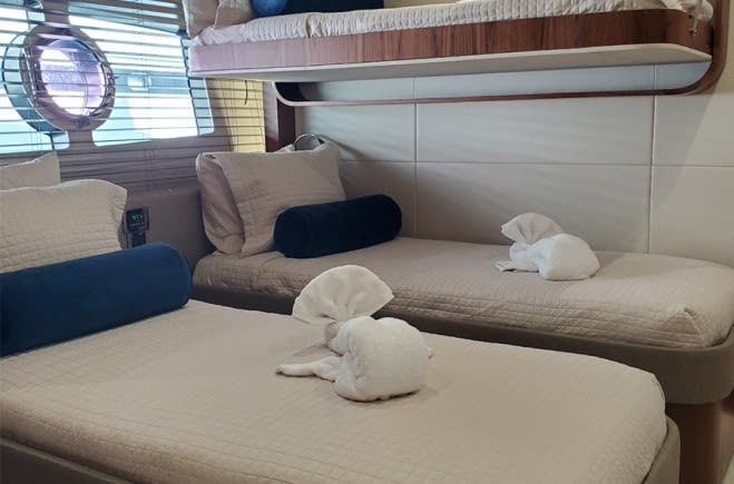 Master Cabin: Full beam with 1 king size bed and en suite head VIP Suite: 1 king size bed with en suite head Starboard Cabin: 2 twins convertible to a Queen, with a Pullman Port Cabin: 2 twins convertible to a Queen, with a Pullman
