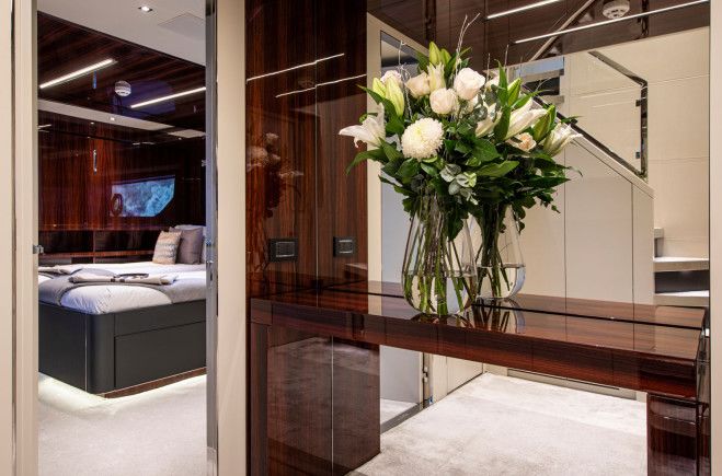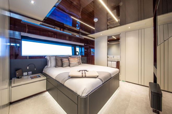 The master suite is located in the port-side lobby, the Owner’s Suite is a full-beam apartment, with glazing designed to reflect masses of natural light into the room, highlighting a marvellous light and dark colourway and a collection of sophisticated furnishings. The room includes a king-size bed with double wardrobes located either side; low-height cupboards and drawers; a walk-in wardrobe; and an en-suite that features a large walk-in shower and vanity unit. The master bedroom can also be turned into a private office with ease, thanks to its retractable Zoom screen.