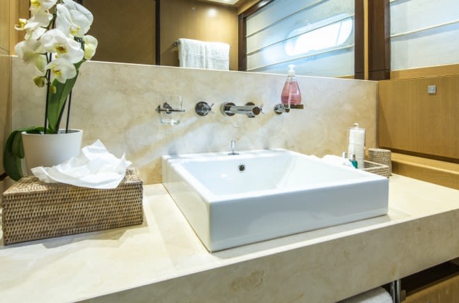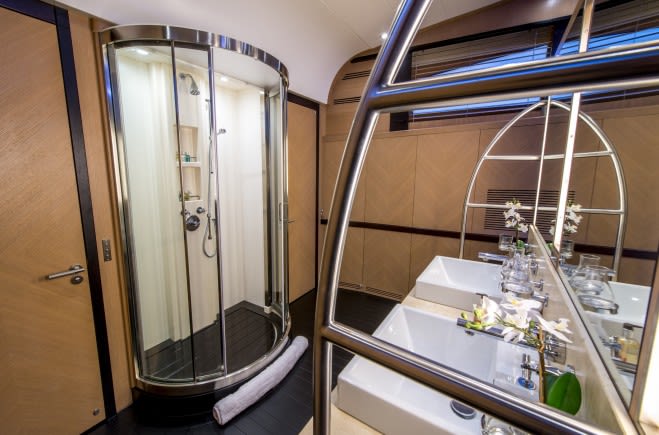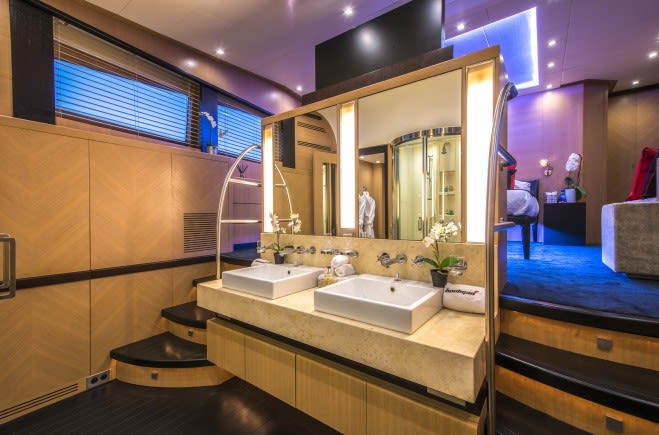 Master cabin: on main deck, sunken bathroom in the with two sinks, one shower, one separate and closed toilet, one dressing room