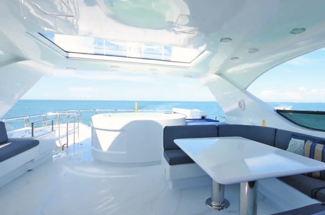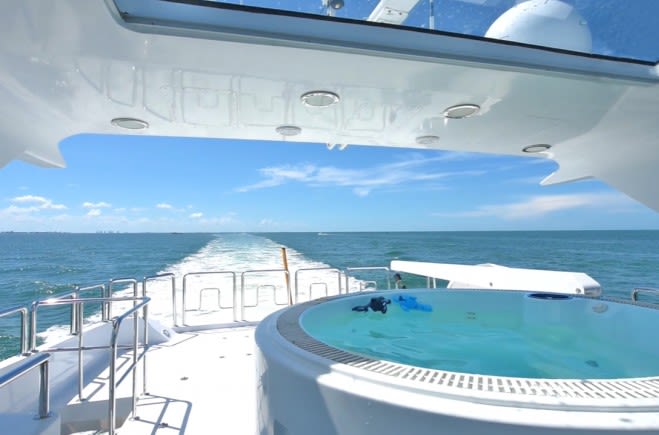 Jacuzzi located on fly bridge, with sunbeds for lounging