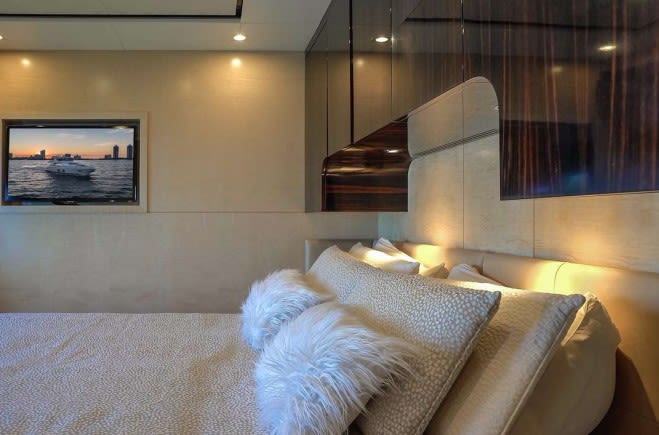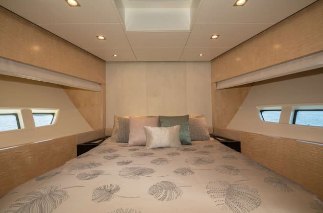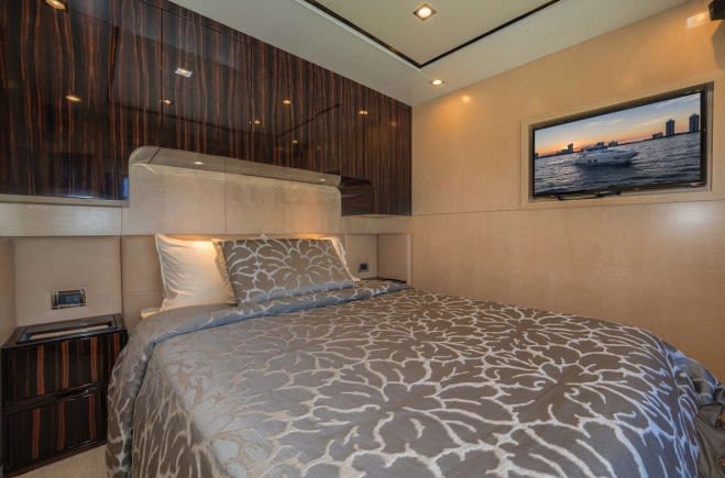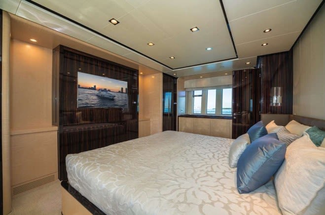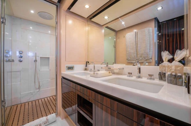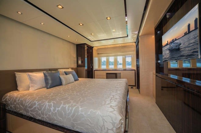 On her lower deck, the symmetrical layout was imperative for the optimization of space, flow, and to provide windows to all the staterooms for calming berth ocean views. The master is located midship, accessible via a private staircase, and features ensuite bath & shower with double vanity, walk-in closet, and wide windows.
