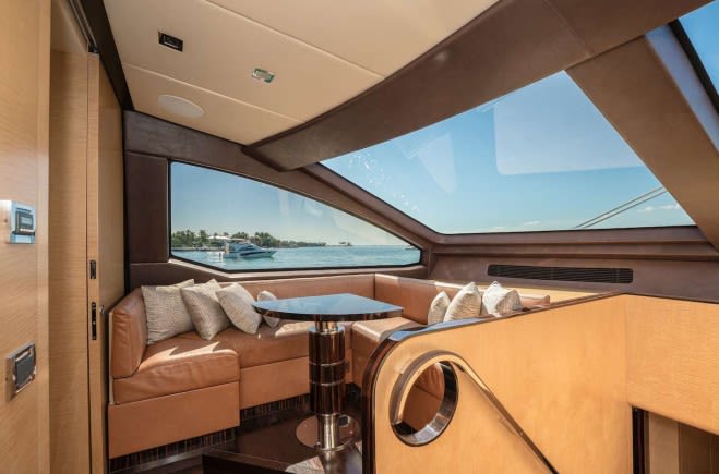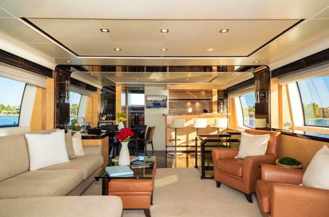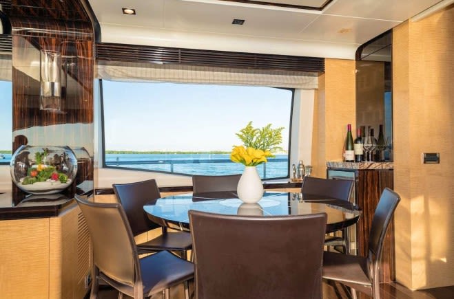 Her main deck consists of a refreshing saloon, illuminated by bright natural lighting from her expansive windows. PHOENIX features a galley that is widened from previous models to provide visibility and ease of service to the immediate bar area.