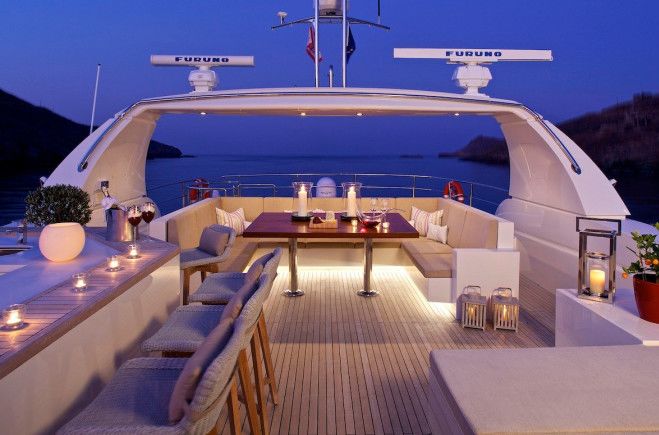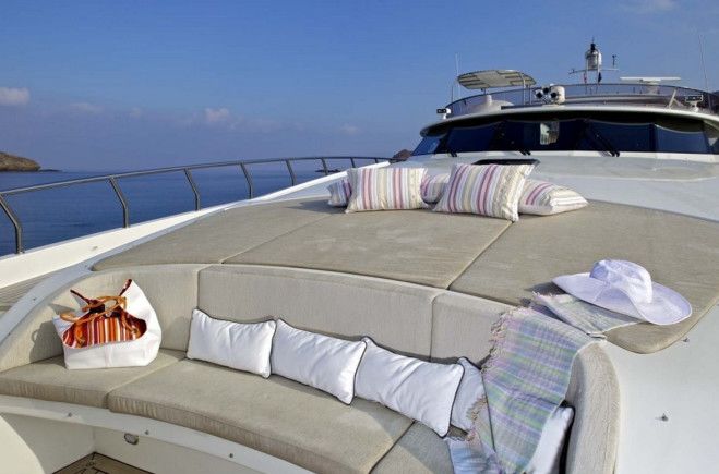 Her vast upper deck includes a bar, large sunbeds and a dining area for 12. Guests will no doubt spend their days sunning themselves and sipping cocktails in this vast communal socializing space. Those on board can also enjoy the warm weather on Sanjana’s forward sunbathing area, and for those seeking shade, there are tents available on the sun deck.