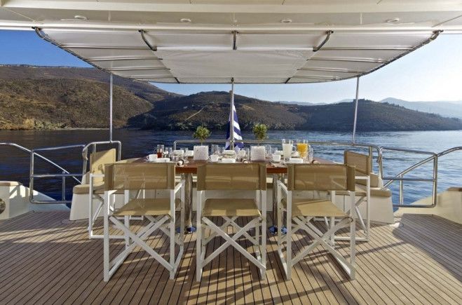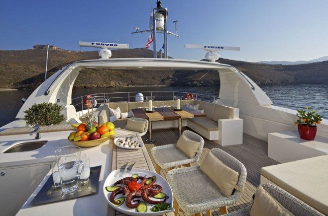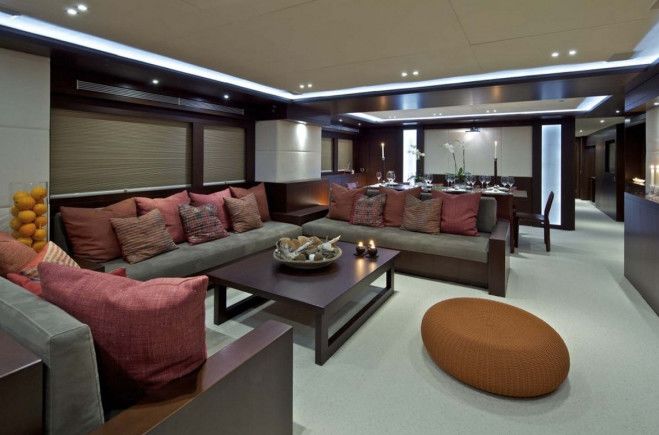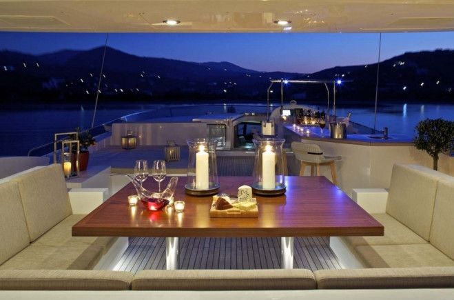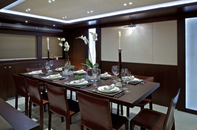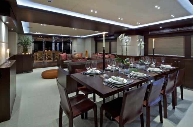 Her main salon has a stylish, modern design with ample seating areas for guests. Her formal dining space can host eight guests. This space has large windows throughout, and the open-plan layout is perfect for large groups socialising. The large sliding glass doors lead out to the aft deck, for more dining space and alfresco living options.