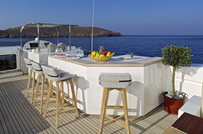 The elegantly designed cabins are a blend of traditional wooden elements and chic, neutral colours. Two of her cabins can be turned into triples, and she can also accommodate two extra guests in her salon, which makes her a great option for families and large, mixed groups. Her stunning full-beam master is located on the main deck, and is complete an ensuite that features a generous mirrored walk-in closet.