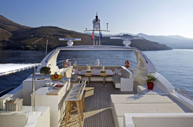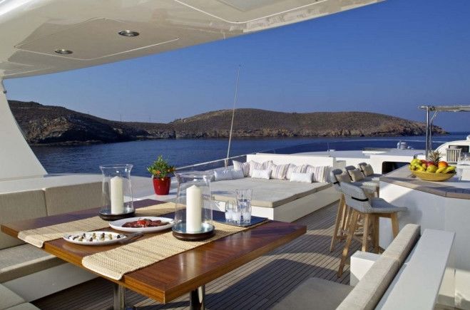 Vast upper deck including a bar, large sunbeds and dining area for 12