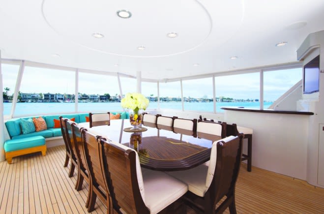 Complete eisenglass enclosure (optional) for the entire main deck aft with dining for 12 around a custom wood table