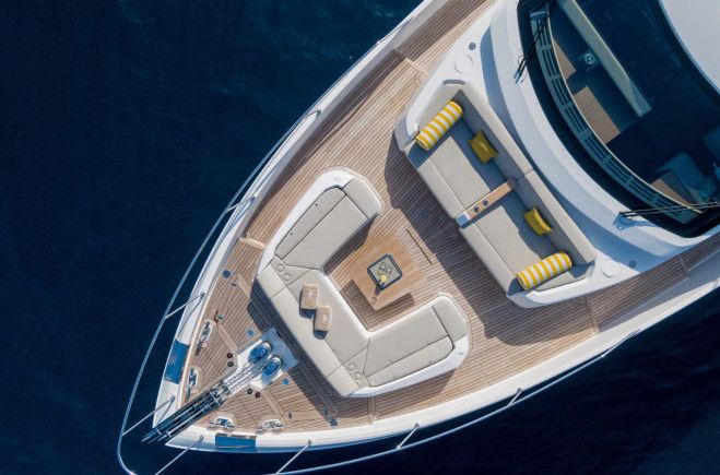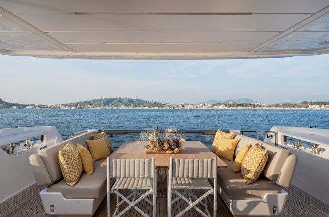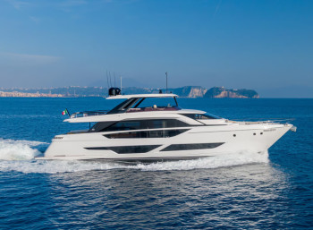 The Ferretti 860 VITTORIA is the latest creation from Ferretti Group Shipyard, featuring exterior design by Filippo Salvetti and interior by Ideaeitalia. With an overall length of 26.95 m she provides space and furniture of a much much larger yacht. The fresh and contemporary interior stands out for its unmistakable style and for the full-height windows that flood with the yacht with natural light. The helical staircase on the main deck leads down to the lower deck, where there are 4 double cabins, including 1 Master with king size bed based amidships and 1 VIP with queen size bed based forward, 1 double and 1 Twin. All cabins are air conditioned, with en-suite facilities and TV SAT. Ferretti 860 VITTORIA is an innovative yacht with dynamic and clean lines. The cockpit’s area is furnished with two sofas and a table that seats up to 8 people. The flybridge has a dinette, a multi-function bar unit and comfortable sun beds. Forward you can find a sunbathing area with sofas and a coffee table. VITTORIA comes with gyroscopic stabilizers and vector fins that give the yacht a great stability both at anchor and underway. Furthermore she has a very low fuel consumption. Boasting a vast array of water toys, this Ferretti 860 is operated by 4 crew members. She is equipped with Starlink high speed internet.