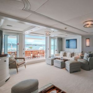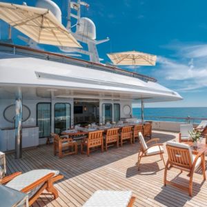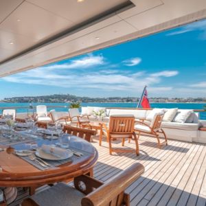 All the deck spaces are sumptuous and a continuation of the interior style; the vast sundeck is a highlight of the design and incorporates a Jacuzzi pool surrounded by an expansive sunbathing terrace, a bar and two tables for informal, alfresco meals, allowing guests to drift through the day enjoying the finest cuisine and service in great privacy. The upper deck offers a great alfresco dining option, an ideal spot for enjoying the beautiful surroundings in style, with seating for up to 16 guests creating the ideal outside space for entertaining with family and friends.