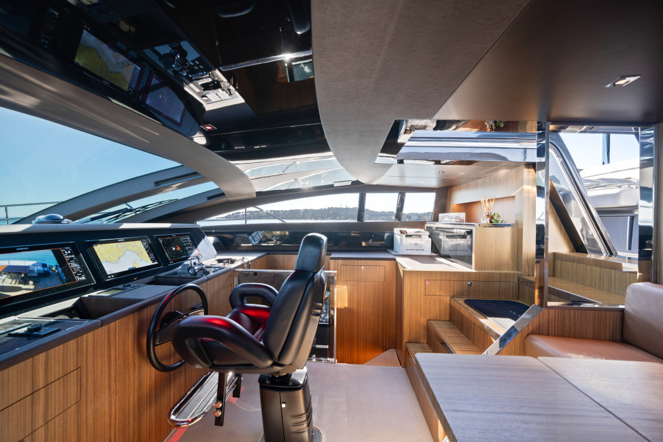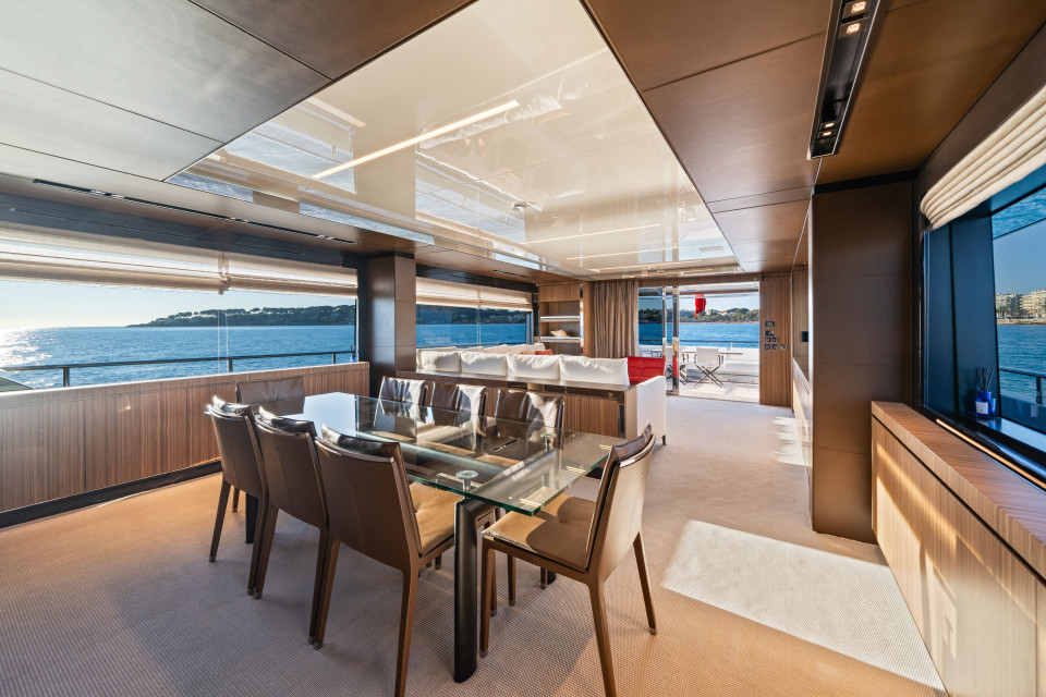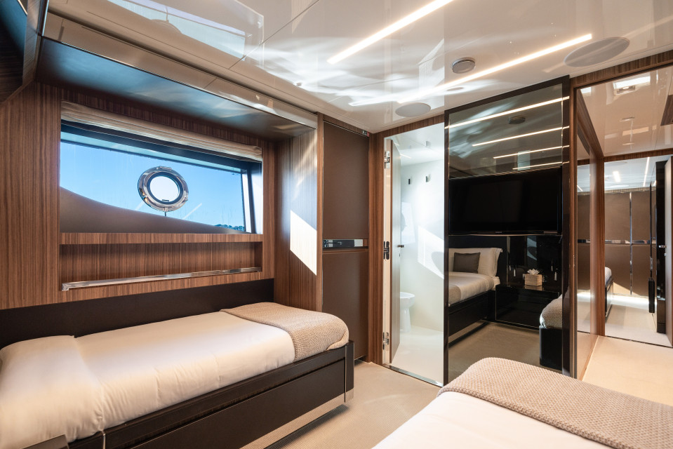 Powered by twin MTU 16V 2000 M96L-2638hp, she reaches exhilarating speeds of up to 28 knots.
