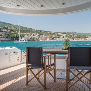 There is a spacious area for dining on the aft deck, and large seating and sunbathing areas on the flybridge and foredeck. Luxury yacht EMPRESS also benefits from a hydraulic swim platform for easy access to the water. Her asking price is €800,000.