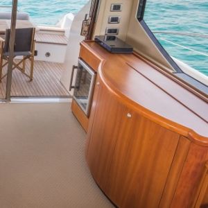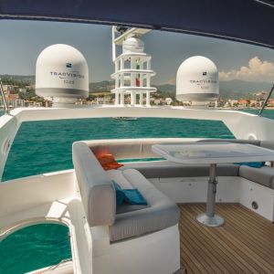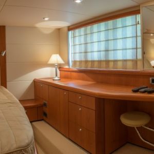The yacht can accommodate 6 guests in 3 spacious cabins all located in the lower deck. She benefits from one full beam master cabin, one VIP cabin and one twin cabin, all with ensuite facilities. There is a crew cabin aft with separate access.
