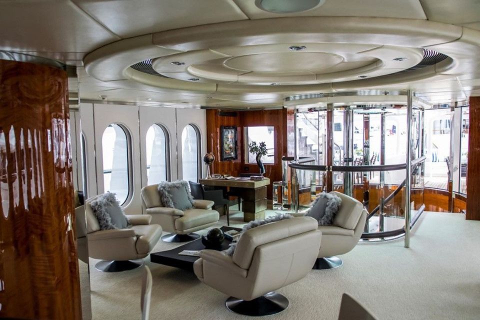 On the upper deck, All Star 1 features a salon with a full service bar, seating areas with floor-to-ceiling windows and a forward observation lounge arranged around a circular sofa. Exterior spaces include an aft upper deck dining area for up to twenty guests and a hydraulic transom door forming a beach club with diving board.