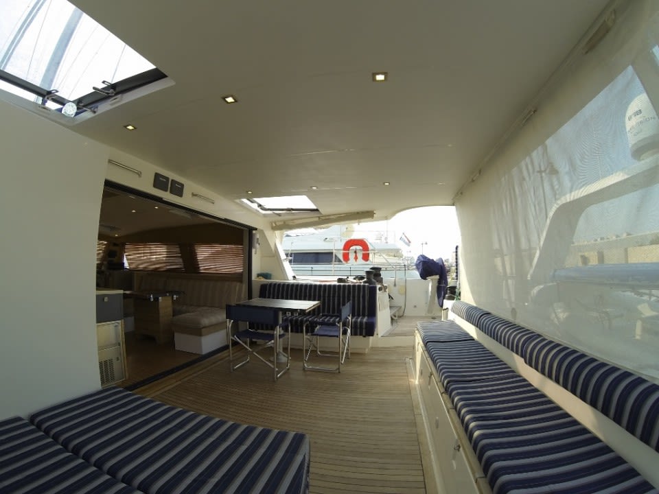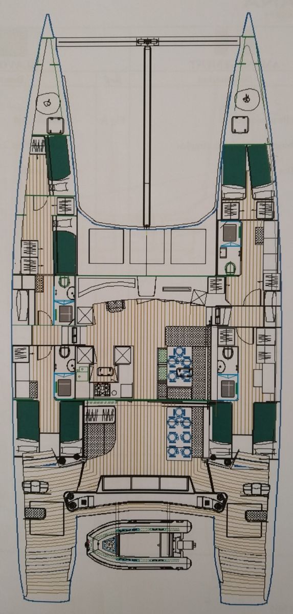 Tanks Fresh water: 800 ltrs (2 x 400 ltrs) Fuel tanks: 2600 ltrs (2 x 400 & 2 x 900) Engines Engine: 2 x 240 HP – Yanmar type 4LHA-STP engines Thrusters: Bow Thrusters on each hull Props: 4-blade folding props Generators: 2 x Cummins ONAN at 7.0KW and 13.5KW Service Histories: Available Navigation, Electronics and Safety (All Raymarine) ● Chartplotter ● RADAR ● VHF ● GPS ● Echo Sounder ● AIS ● Navtex ● Anemometer ● Main Helm Console includes: ● Main Engines – tachometers, oil pressure gauges, water temp gauges, alarm panel ● Generators – Control Unit and Alarm Panel ● Bilge Pump Indicators ● Charge Management Panel ● Raymarine Multifunction Display ● Bow Thruster Joystick