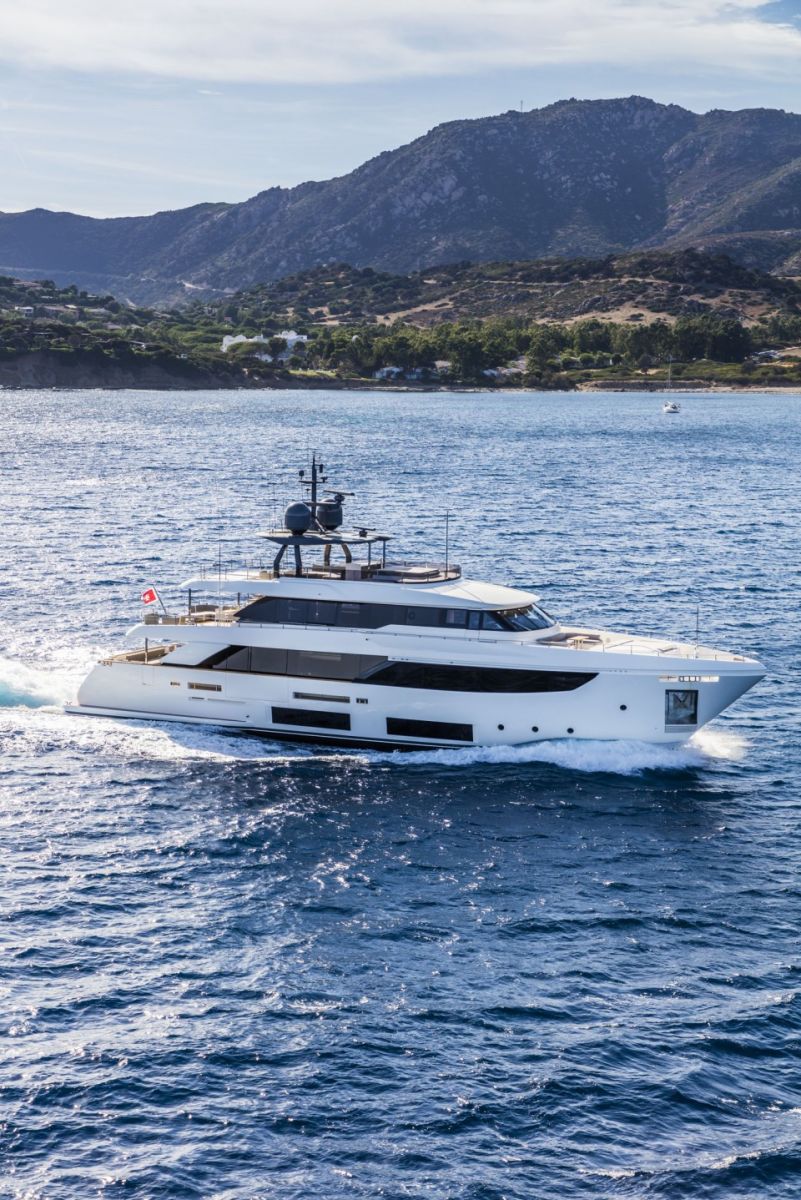 Custom Line’s latest models: the patented DMT system for optimum use of the stern area; VOTIS software for flexible, practical management of the entertainment systems on board; and an integrated helm station, for completely safe sailing and monitoring of the systems and equipment on board. Absolute comfort is also guaranteed in terms of stabilisation when at anchor and when mooring, thanks to electro-hydraulic stabilising fins with zero speed mode.