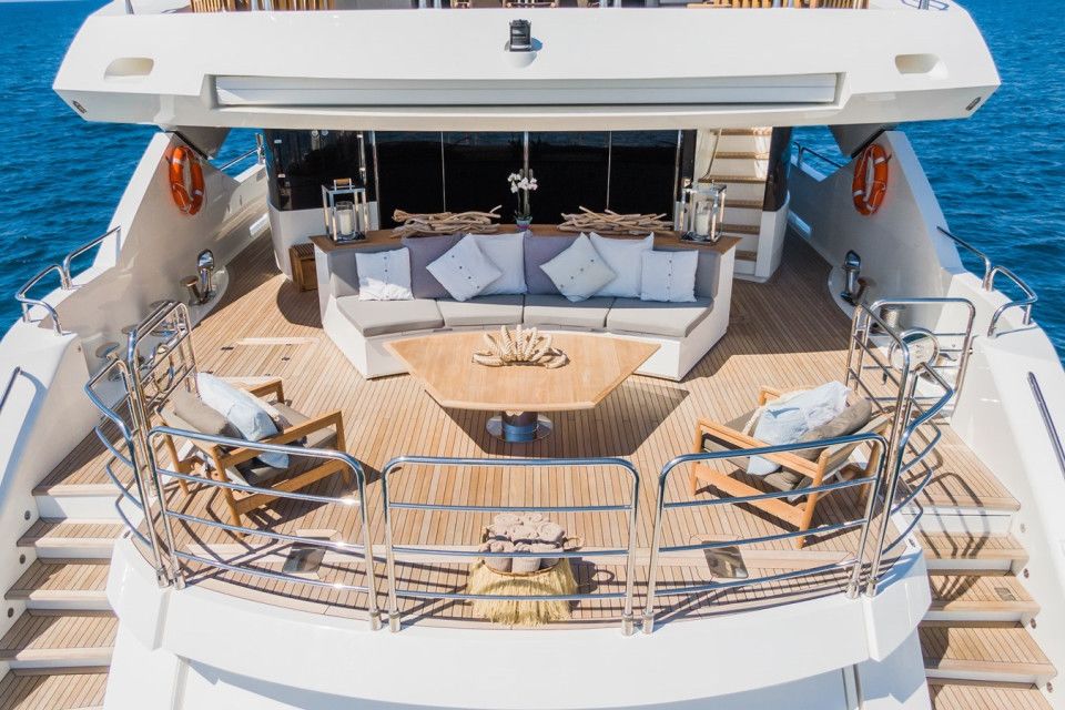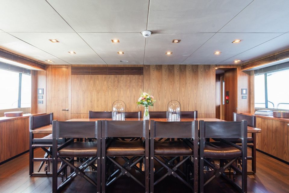 The main deck features a lounge, separate dining area and full galley, while on the upper deck, you’ll find the skylounge, cocktail bar, gaming table, exterior dining and access to the beautiful sundeck. As impressive out in open water as it is in the marina, this stunning model is a leisure marine marvel. A contemporary interior features fine woods and chocolate leathers throughout creating a warm ambience where guests can unwind. A quartet of white leather sofas feature in the main saloon with dark wood coffee tables in the centre and a large forward dining table surrounded by 12 director-style dark leather chairs. A second saloon on the skylounge offers a circular games table to one side and a large L-shaped sofa to the other facing a flatscreen television. Sliding glass doors on this level lead out onto the bridge deck aft where al fresco dining is best enjoyed. Alternatively, guests can enjoy a light lunch up on the sundeck which has been designed with casual entertaining in mind. A lounge and dining space sit centrally beneath the shade of the hard top with an awning that extends forward and aft. A forward jacuzzi with a swim up bar is found forward with four bar stools, while the aft area is dedicated to sun lounging with a fan of sunpads with adjustable back rests. Power comes from twin 3180 Hp MTU diesel engines delivering a top speed of 24 knots, a cruise speed of 20 knots and a range of 1,500 nautical miles at an economic speed of 10 to 12 knots. Zero-speed stabilisers ensure comfort when underway and at anchor.