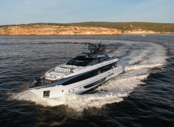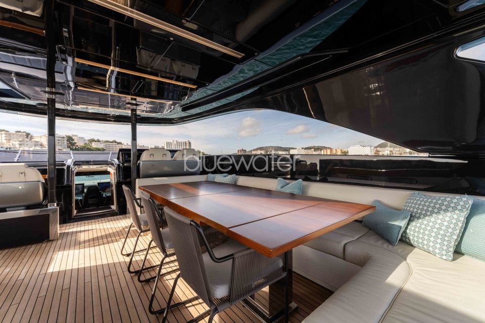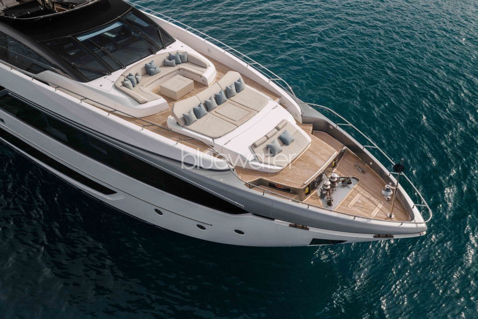 Penned by Officina Italiana Design in collaboration with the Ferretti Group engineering department, she features expansive deck spaces with al fresco dining on two decks with bar, multiple shaded lounging options, and a modern, elegant interior.
