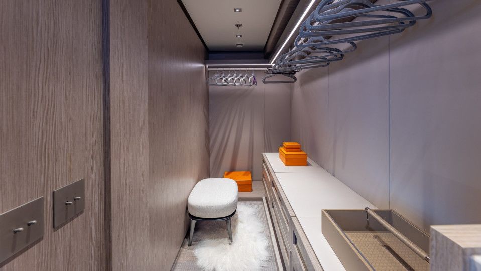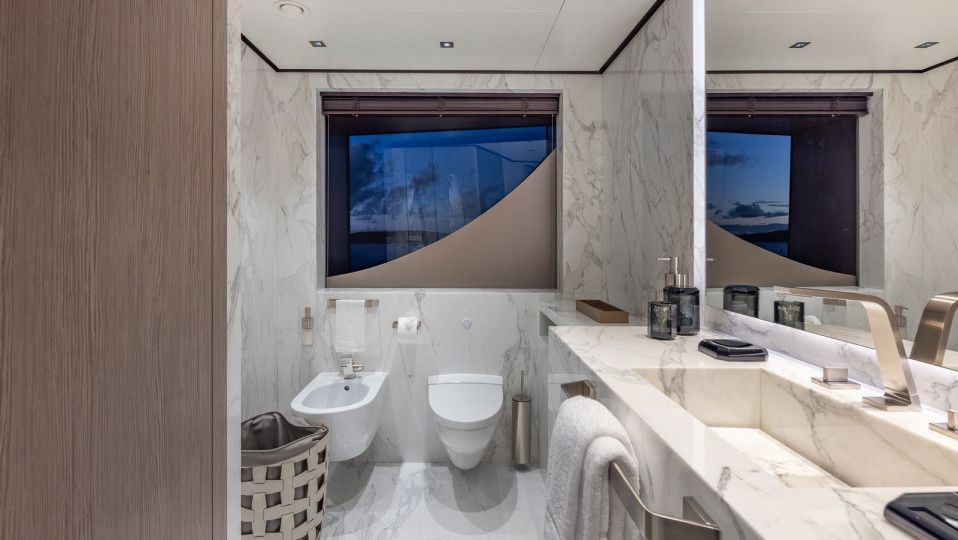 Accommodating up to 12 guests in five spacious cabins, GIOIA offers generous areas for relaxation and entertainment. The full-beam master suite is located on the main deck and includes a private lounge, his-and-hers walk-in wardrobes, and a his-and-hers bathroom. Four additional guest cabins are situated on the lower deck, including two double cabins and two twin cabins with Pullman bunks – all appointed with en suite bathrooms.