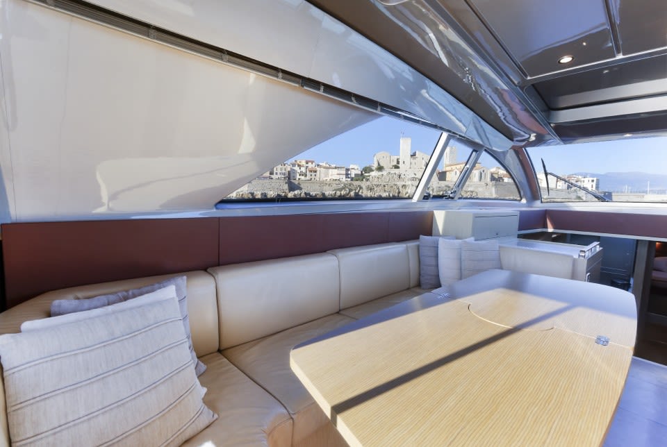 Riva style, there is nothing spared in the attention to detail onboard; from her teak handrails to the curved cross strips on the Passerelle grating, the mini-Bimini that is incorporated over the head of the forward sun bed means you can enjoy shade or sun at the touch of a button.