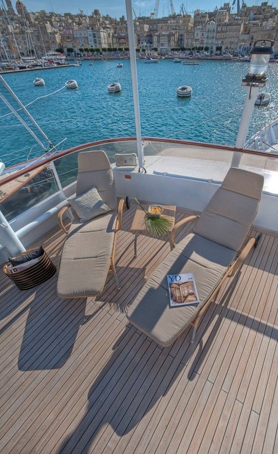 Outside, ample space awaits for entertainment and relaxation. The upper bridge deck features a covered gym area and an open seating area, while further aft offers storage for the main tender and a hydraulic crane. On the main deck aft, a private and enclosed seating area with a large circular teak table provides a perfect setting for intimate gatherings, accommodating up to 10 guests.