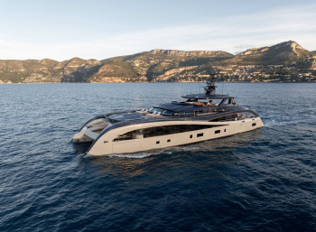 Designed by Meyer Davis with subtle New York influence and inspired by sun, sea, and sand, her interiors exude relaxed luxury with a focus on natural textures and sustainable design. Her striking low-profile exterior by Fulvio De Simoni Yacht Design features three exceptional outdoor living spaces— an aft cockpit with a tranquil pool, an expansive sundeck for effortless lounging, and a versatile bow area with a hidden pool that transforms into an open-air cinema. Solar integration and lightweight construction further elevate her efficiency while keeping luxury uninterrupted.