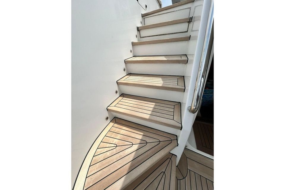 The elegant high gloss woodwork and excellent choice of furniture offers maximum comfort and luxury. Outdoor space is extensive with a substantial aft deck for al fresco entertainment and dining. The enclosed flybridge lounge offers a second indoor saloon area on the upper deck with a large sunroof. Heading aft leads to the glass doors that opens up to the outdoor balcony which offers ample room for social activities, sun-lounging and dining. The foredeck has plenty of entertainment space with sun pads, built-in seating and two teak coffee tables to offer relaxation in total privacy. An electrical windlass also enables two jetskis or tenders to be stored on the deck.